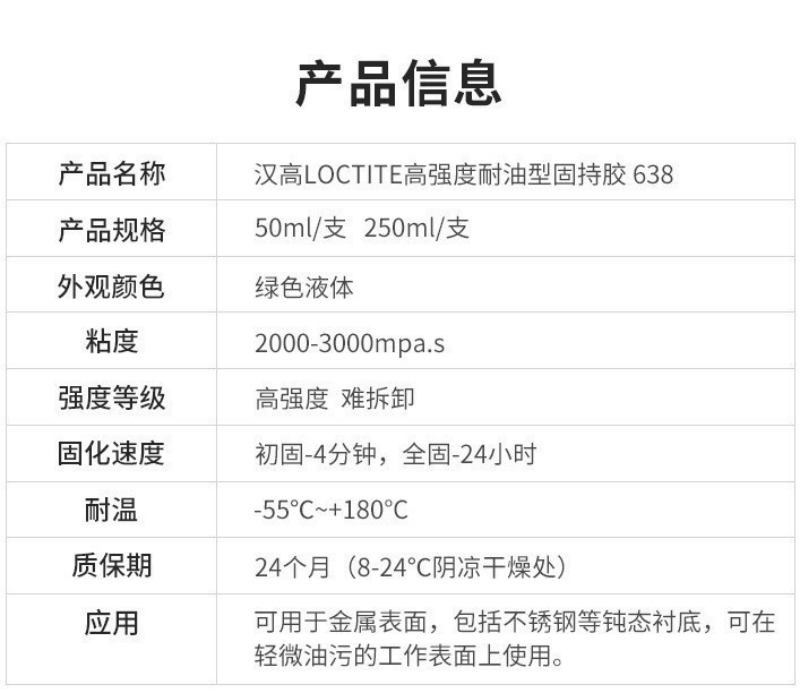 是一种高粘合强度的圆柱形配合件固持胶。它可以填����� �������Ƴ������������ �������Ƴ������������ �������Ƴ������������ �������Ƴ�������充圆柱形部件间的所有间隙并固化形成坚硬的热固性塑����� �������Ƴ������������ �������Ƴ������������ �������Ƴ������������ �������Ƴ�������料使部件结合成一整体,防止冲击和振动����� �������Ƴ������������ �������Ƴ������������ �������Ƴ������������ �������Ƴ�������引起的松动和泄漏。该产品在所有金属表面上均可实����� �������Ƴ������������ �������Ƴ������������ �������Ƴ������������ �������Ƴ�������现高强度,包括不锈钢等钝����� �������Ƴ����������� �������Ƴ������������ �������Ƴ������������ �������Ƴ�������态衬底同时,该产品也具有耐受����� �������Ƴ������������ �������Ƴ������������ �������Ƴ������������ �������Ƴ�������表面轻微污染的特性。